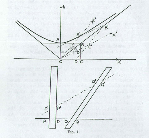 Minkowski himself does a partial “easy calculation” on the second illustration of figure one, which consists of the “parallel bands.” These bands create triangles that are strictly equivalent to those of Michelson and Lorentz, although this is difficult to see at first. You can ignore the first illustration of the figure, the one with the hyperbolas—which is ironic. Just import the terms from the first illustration into the second one. Here I will simplify Minkowski's math even further, to make it completely transparent.